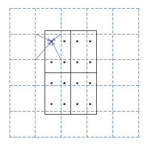 * RoIAlign은 feature map에서 근접한 grid point(파란색 화살표의 시작점)을 bilinear interpolation 연산을 통해 각 샘플링 point를 계산함