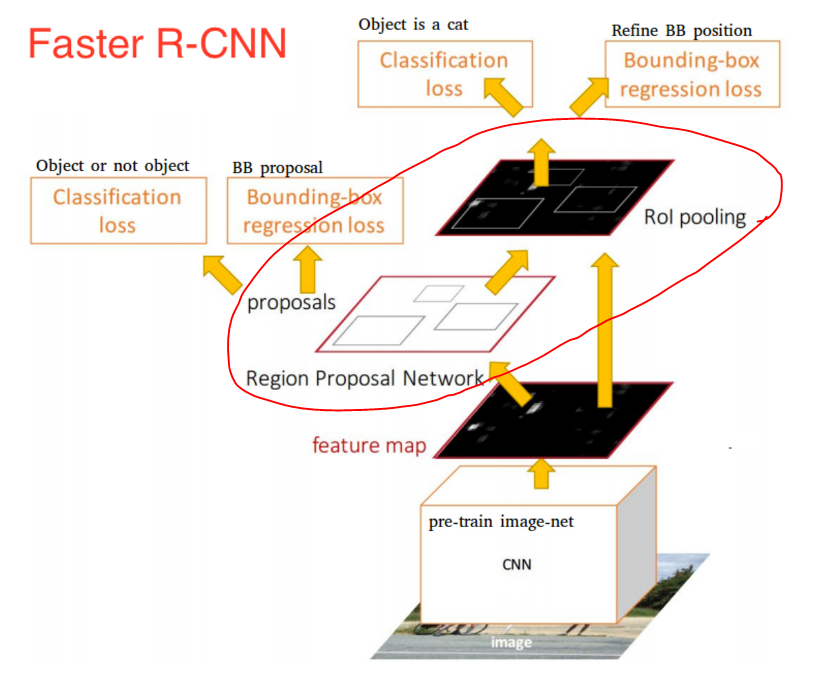 * RoIPool : 다른 사이즈의 Region Proposal이 들어와도, max pooling을 이용하여 output size를 동일하게 만듦 (Faster R-CNN에서 나오는 개념)