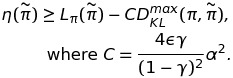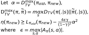이번에는 $\alpha$를 $\pi$와 $\overset{\sim}\pi$간의 distance measure로, $\epsilon$을 적절히 변형해주어 아래와 같은 식을 도출하였다. 그리고 두 policy간 distance measure는 total variation divergence를 이용하였다.(증명은 appendix 참고)