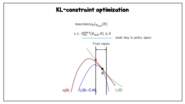 즉, KL divergence metric 값이 일정 범위(hyperparameter) 내에 있는 policy에 대해 surrogate function이 최대가 되도록 하는 policy로 update하는 것이다.