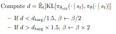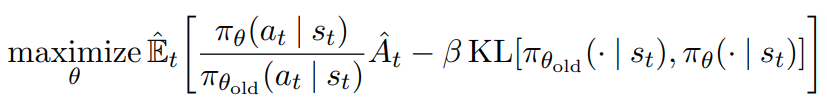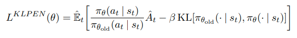 사실 Schulman은 처음 TRPO를 정의내릴 때 특정 surrogate objective가 policy $\pi$의 성능을 보장하기 위한 lower bound를 형성한다는 개념을 따라 constraint방법이 아니라 아래와 같이 penalty 방법(coefficient $\beta$를 지님)을 제시하였다.
