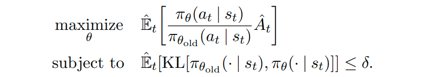 TRPO 논문에서는 아래의 식과 같이 특정 constraint 이내에서 objective funtion("surrogate" objective)가 최대화 되는 policy로 update를 진행하며, 이를 Trust Region Methods라고 한다.
