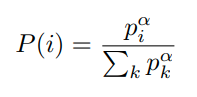 아래 수식은 k개의 transition 중 i번째의 transition의 sampling 확률을 나타내며, $\alpha$는 얼마나 prioritization에 의한 sample을 많이 할 것인가를 결정한다.