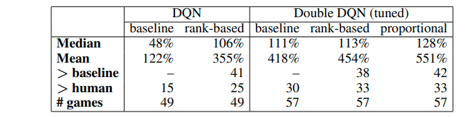 이러한 방법을 Prioritized Experience Replay(PER) 라고 부르며 당시의 DQN보다 훨씬 좋은 성능을 자랑하는 SOTA로 자리매김 하였으며, 기존의 다른 model-free learning방식에 적용해 exploration 성능을 높이는데 매우 효과적으로 사용되고 있다.