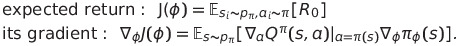 강화학습에서의 목표는 반환값의 기대치를 최대화 해줄 수 있는 최적의 policy $\pi_\phi$(즉 이를 구성하는 파라미터 $\phi$)를 구하는 것이며, 이러한 parameterized policy는 반환값의 기대치의 기울기값을 통해 업데이트 해준다.