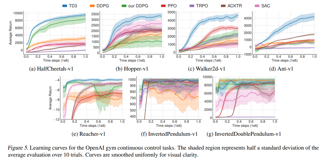 TD3논문 내에 실험내용에 대한 아주 상세한 설명이 담겨있어 자세히 나열해보려한다. 논문에 중요히 언급하지 않은 중요한 스킬들이 담겨있다.